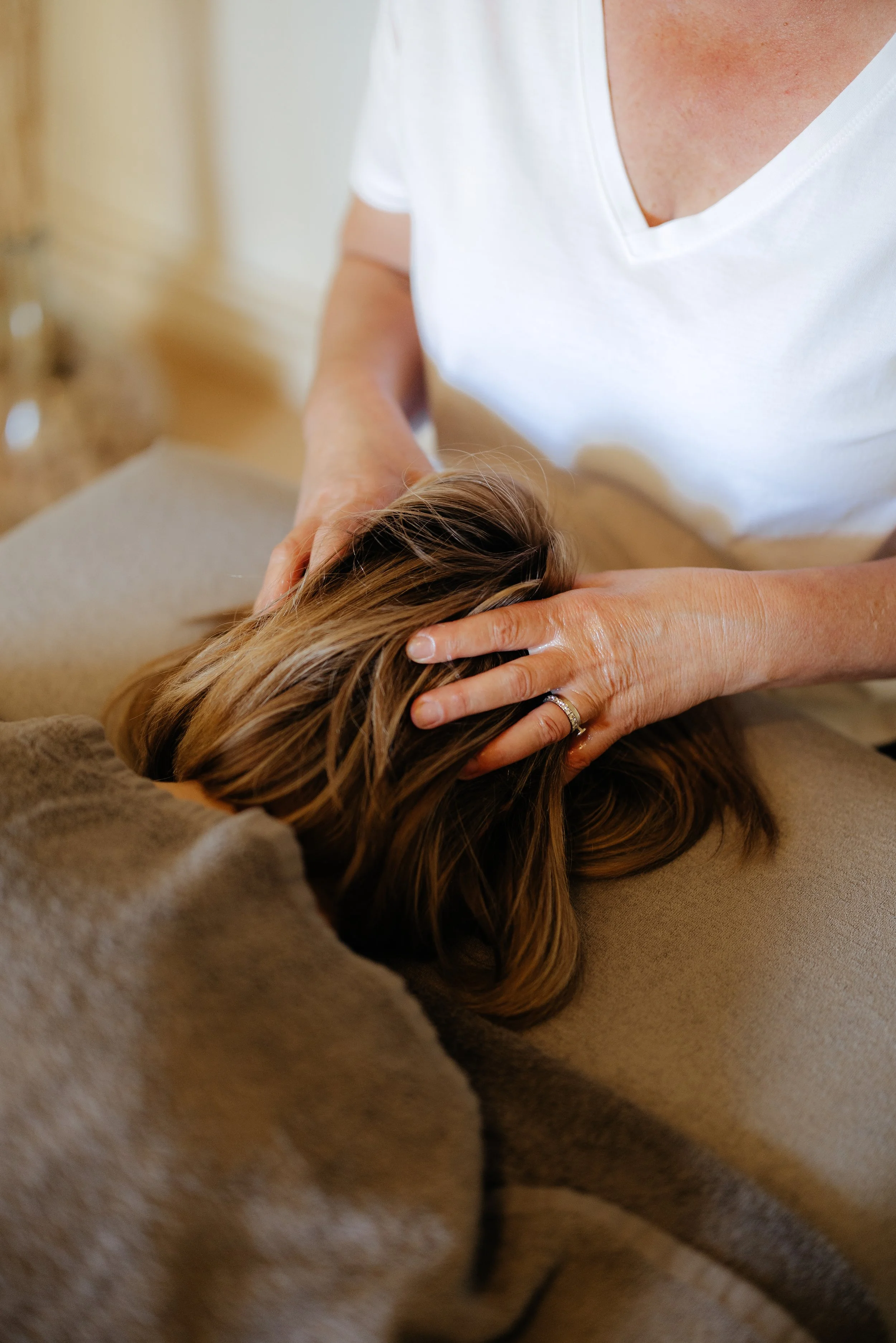 Le massage crânien est un soin doux centré sur la tête, la nuque et les épaules.